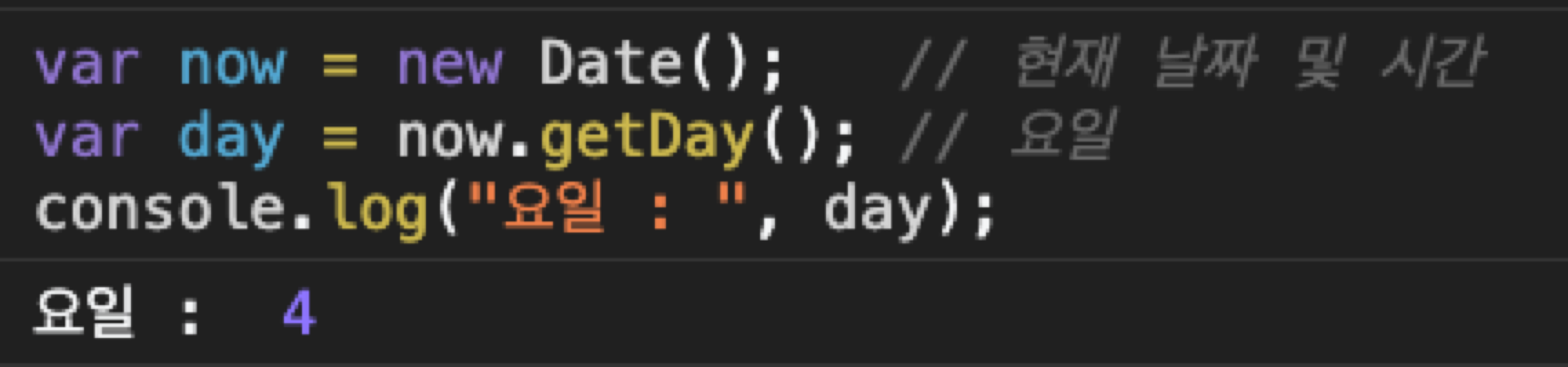 단, getDay()로 요일을 구하면 0~6 까지의 숫자를 반환하는데