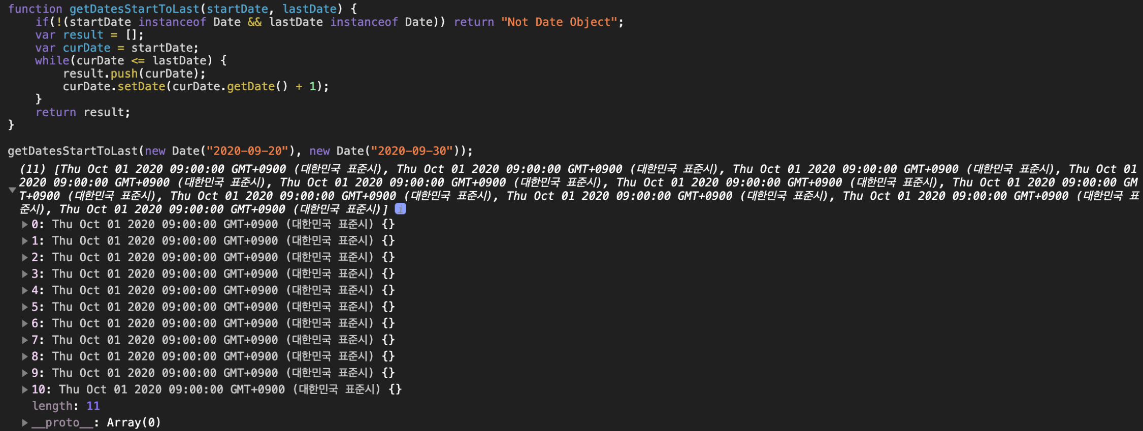 Date 객체로 시작 날짜와 마지막 날짜를 받아, 시작 날짜와 마지막 날짜 사이의 모든 날짜를 Date 객체로 배열에 담아 반환하는 함수