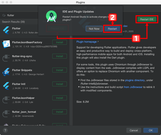 Flutter Plugin과 Dart Plugin 설치가 끝나면 Install 버튼이 Restart IDE 버튼으로 바뀝니다.