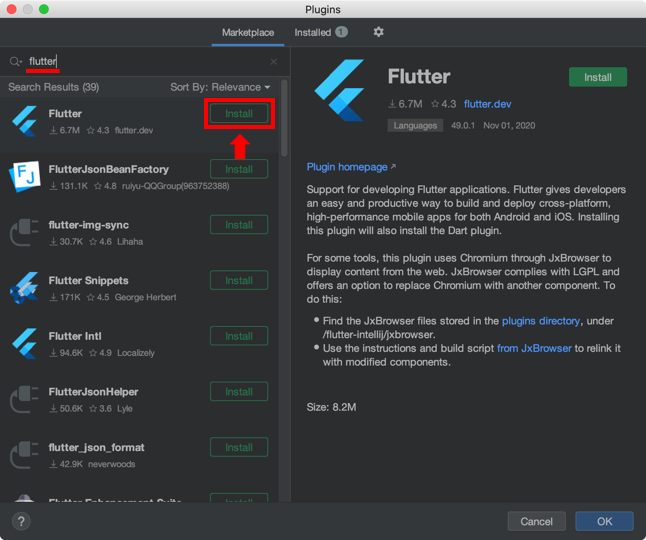 Plugins에서 flutter를 검색하면 Flutter Plugin이 나옵니다.