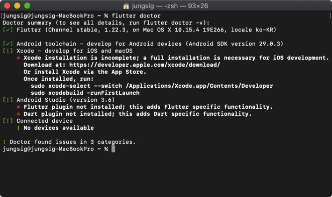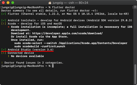 터미널에서도 flutter doctor 명령어를 입력해보면,