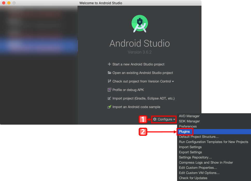 Android Studio를 실행시킨 뒤 Configure에서 Plugins로 들어갑니다.