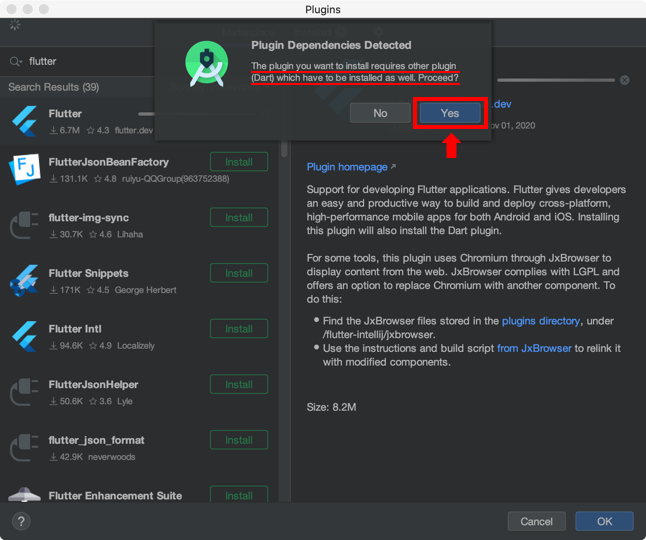 Flutter의 사용 언어인 Dart Plugin도 설치해야하기 때문에 Yes를 클릭하여 한번에 설치하시면 됩니다.