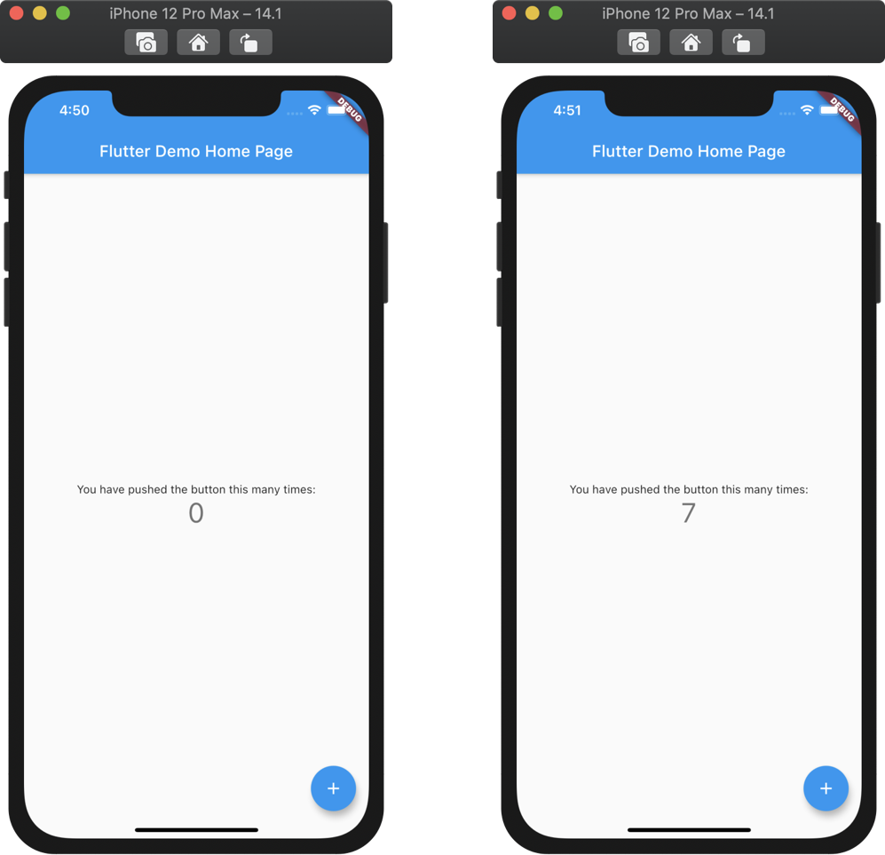 Flutter는 Debug 모드에서 Code를 수정하고 저장하면 실행중인 앱에 곧바로 적용되는 모습을 보실 수 있습니다.
