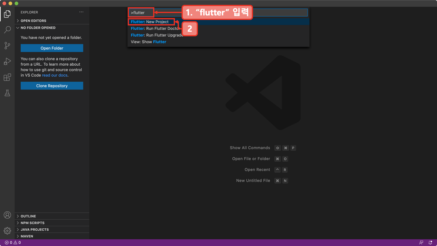 Command Palette에 "flutter" 라고 입력하면, 나오는 Command 중에