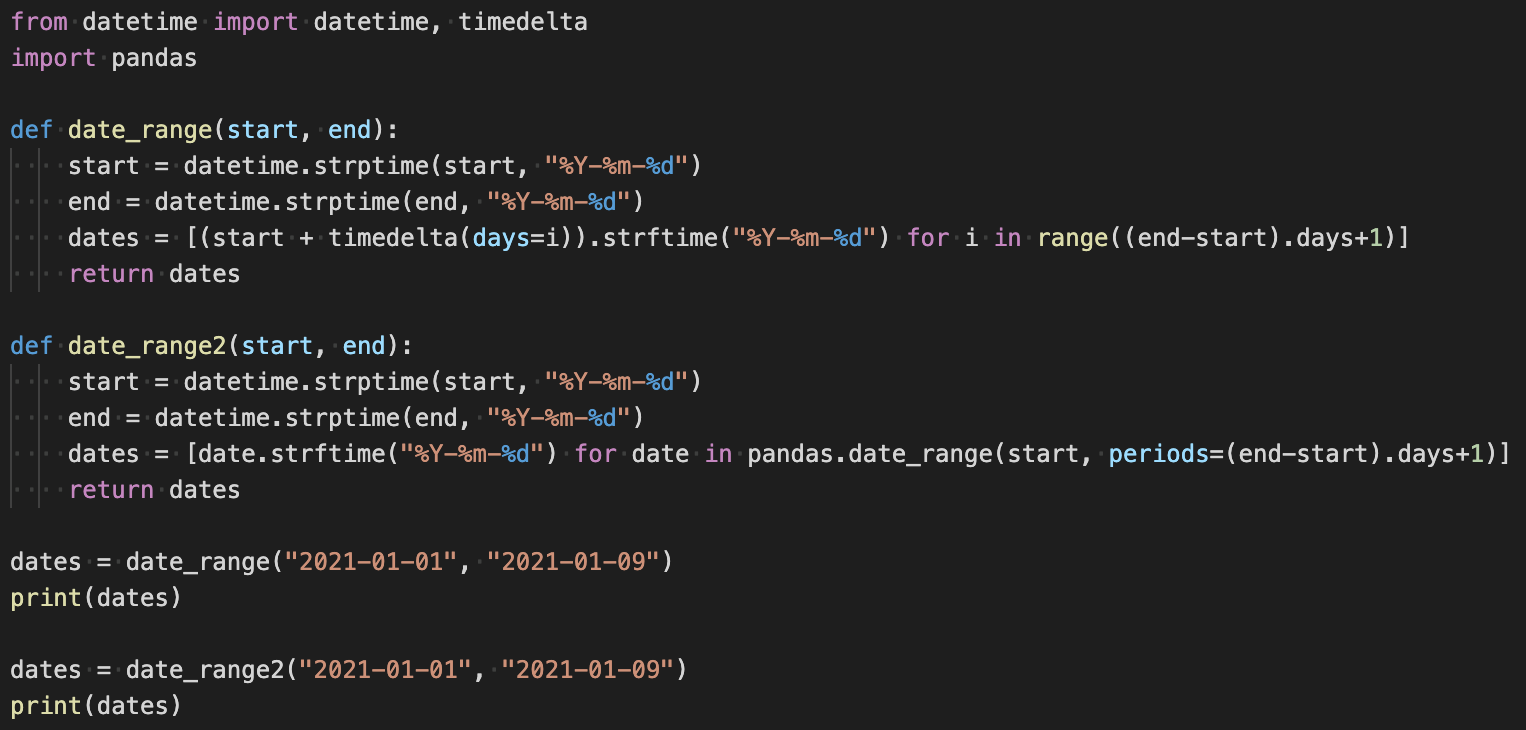 dates = [(start + timedelta(days=i)).strftime("%Y-%m-%d") for i in range((end-start).days+1)]