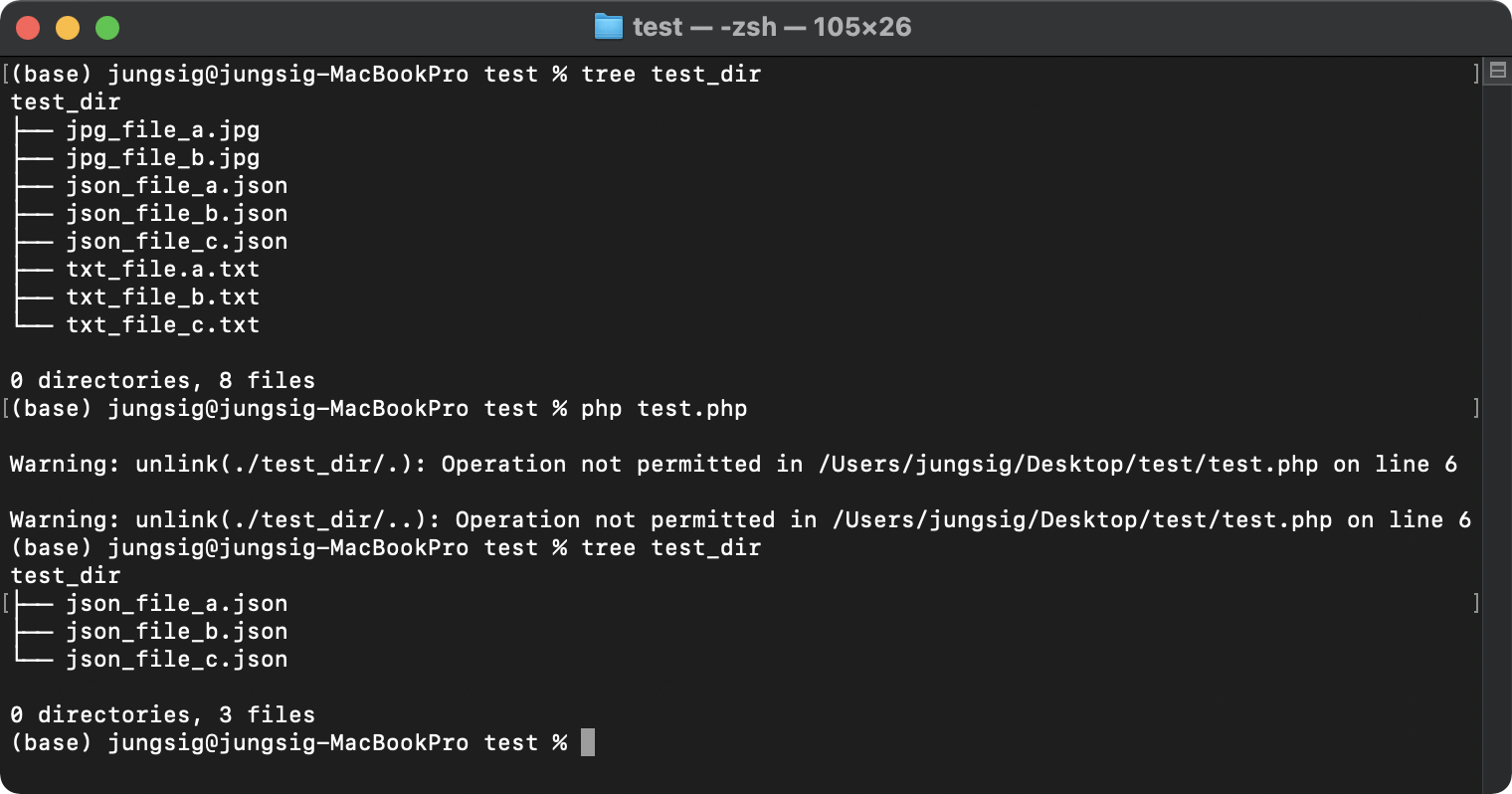 그리고 unlink() 를 사용해 해당 경로의 파일을 삭제한 뒤, closedir()로 닫습니다.