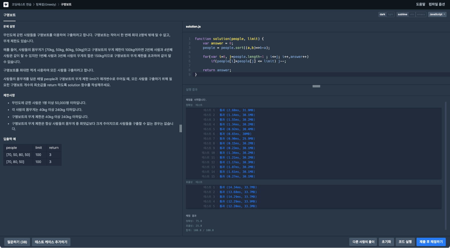구명보트 문제를 JavaScript로 풀어보도록 하겠습니다.