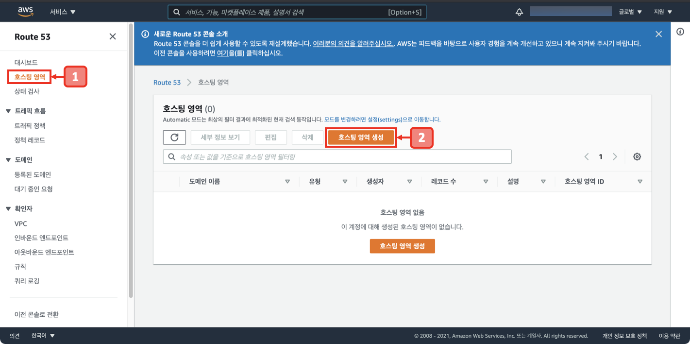 먼저 AWS의 Route 53에서 호스팅 영역을 생성합니다.