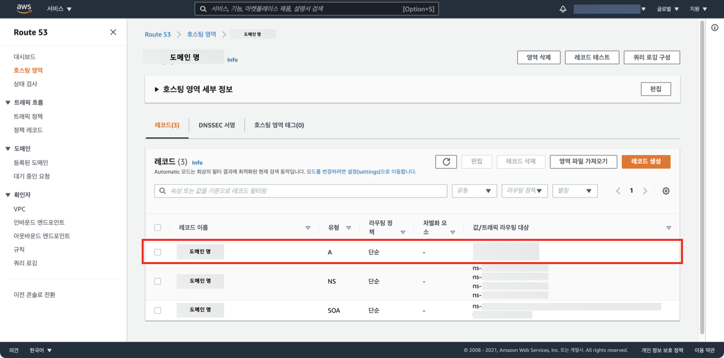 호스팅 영역 생성이 완료 되었고 이제 A 레코드를 생성해야 합니다.