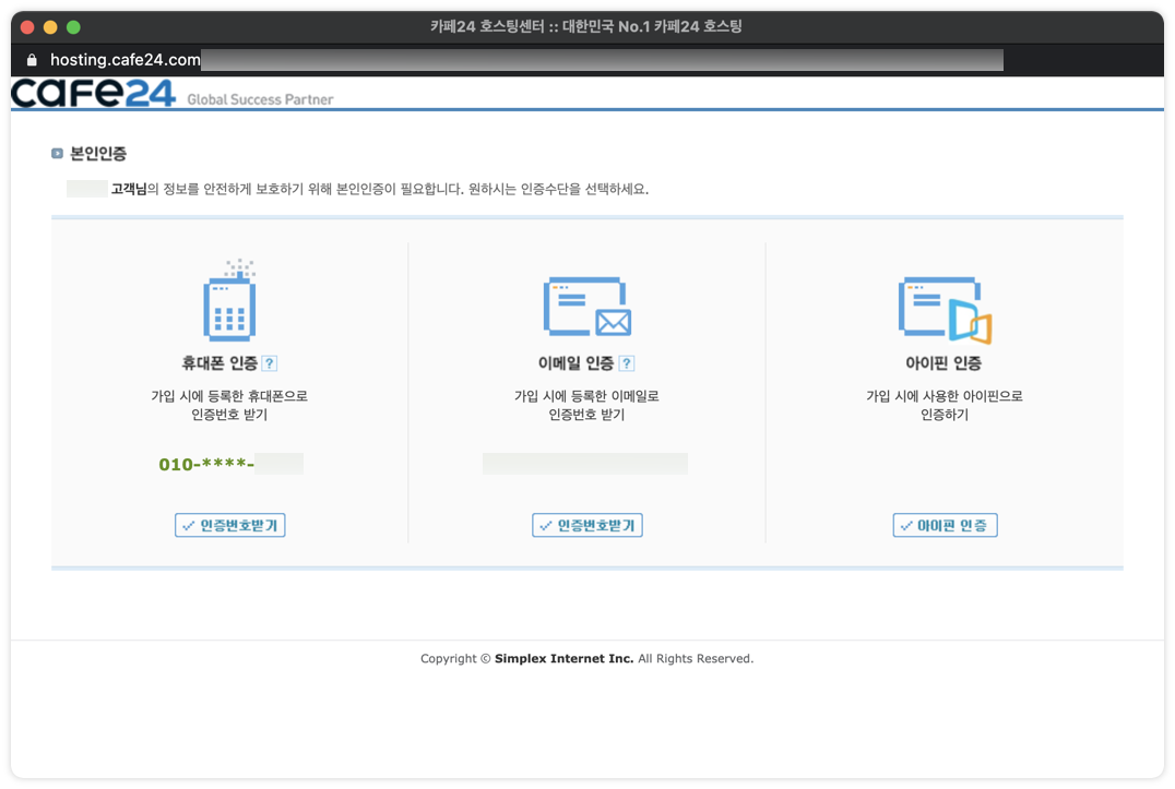 네임 서버 변경을 위해 필요한 인증을 완료합니다.