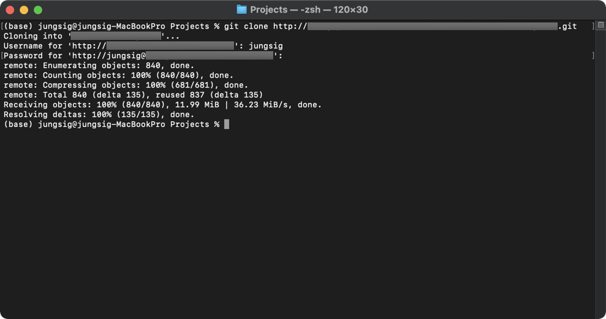 다시 돌아와서, 발급받은 Personal Access Token을 Password 대신 입력하시면 Access denied 되지 않고 진행됩니다.