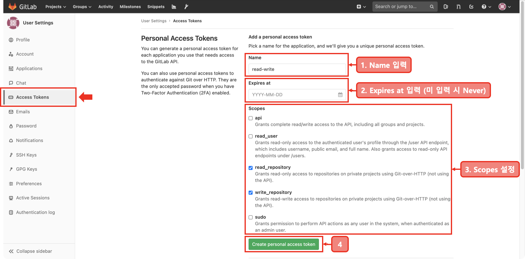 - Expries at에 Access Tokens 만료기간을 입력합니다. 입력하지 않을 시 Never 로 설정되어 만료되지 않습니다.
