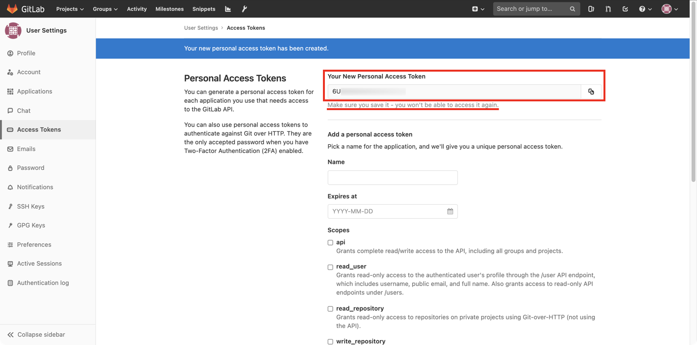 생성된 Token 아래, Make sure you save it - you won't be able to access it again.