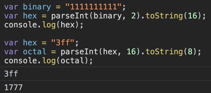 var octal = parseInt(hex, 16).toString(8); // 16진수에서 8진수로
