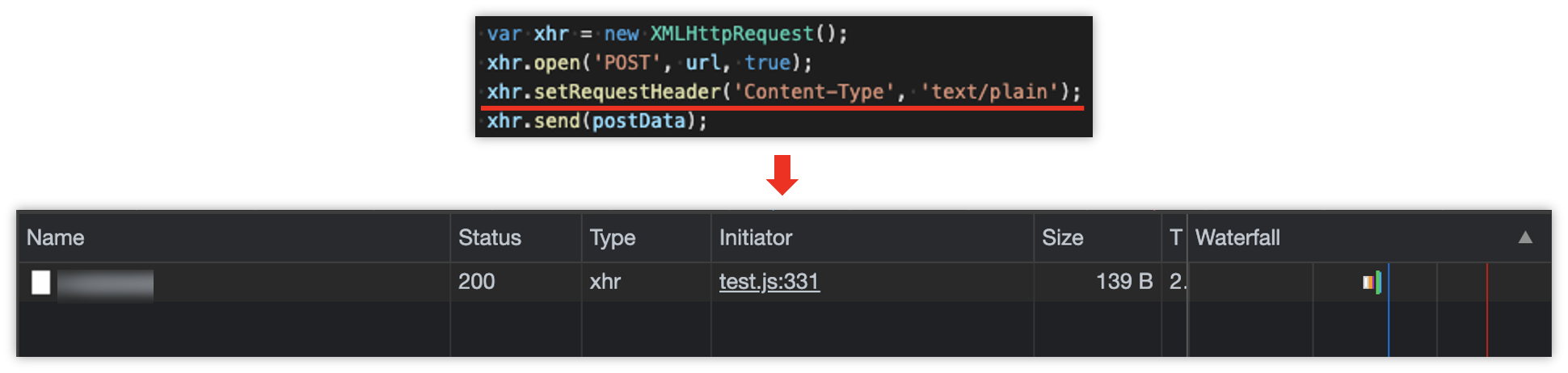 하지만 위와 같이 Simple Request 조건에 충족하도록 Content-Type을 text/plain 으로 설정하였을 때는,