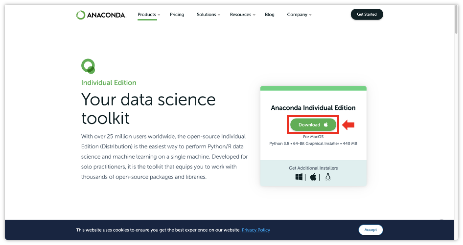 아나콘다 사이트에서 다운로드 버튼을 클릭하여 패키지를 다운받습니다.