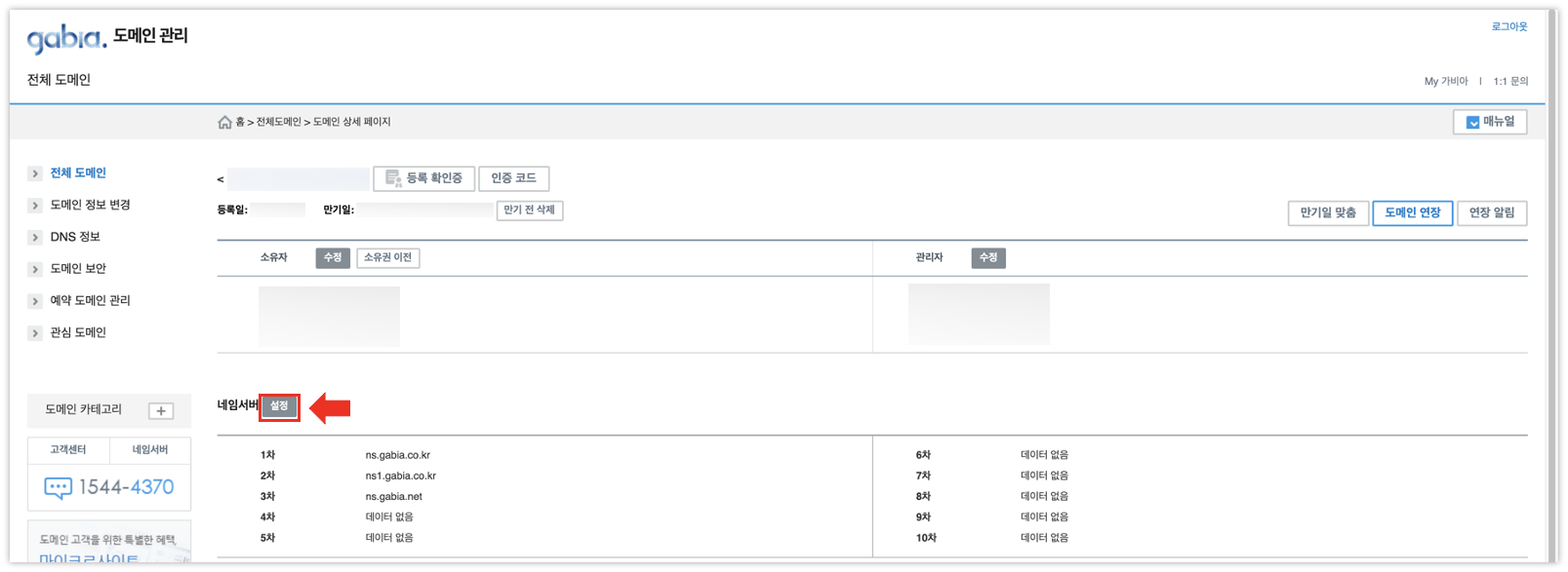 도메인 관리 페이지에서 네임서버 설정 버튼을 클릭합니다.