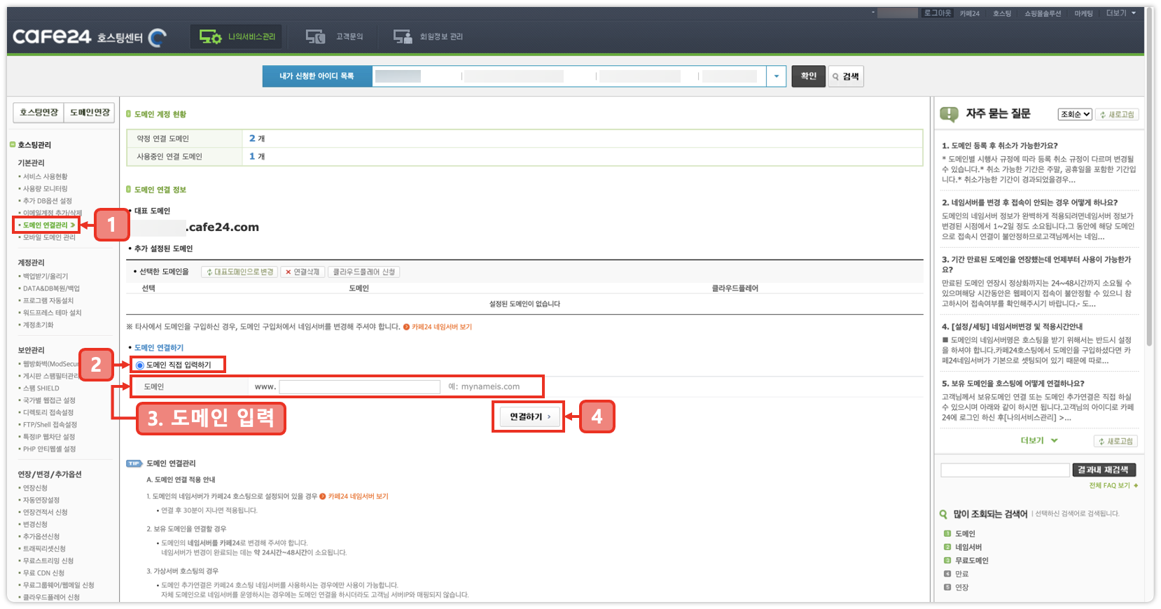 호스팅 관리 > 기본관리 > 도메인 연결관리로 갑니다.