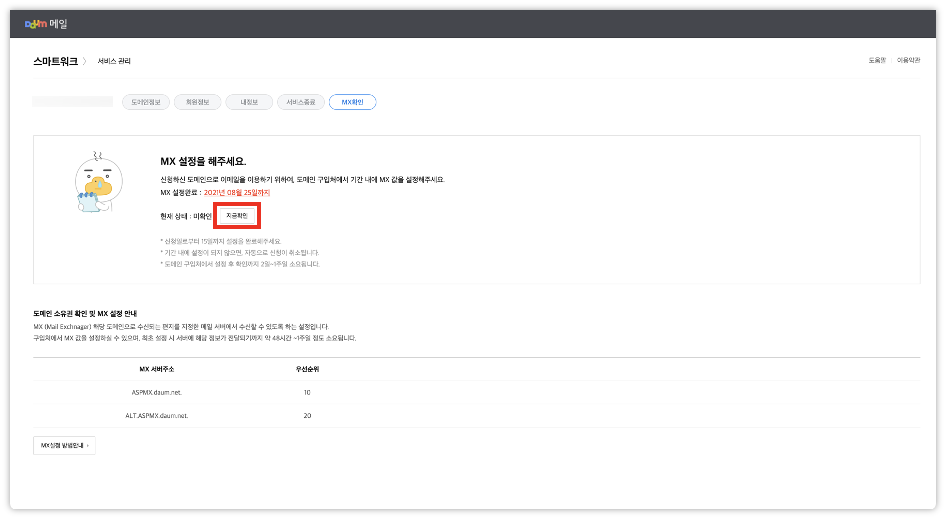 메일서버(MX) 관리를 클릭하면 MX를 추가할 수 있는데요.