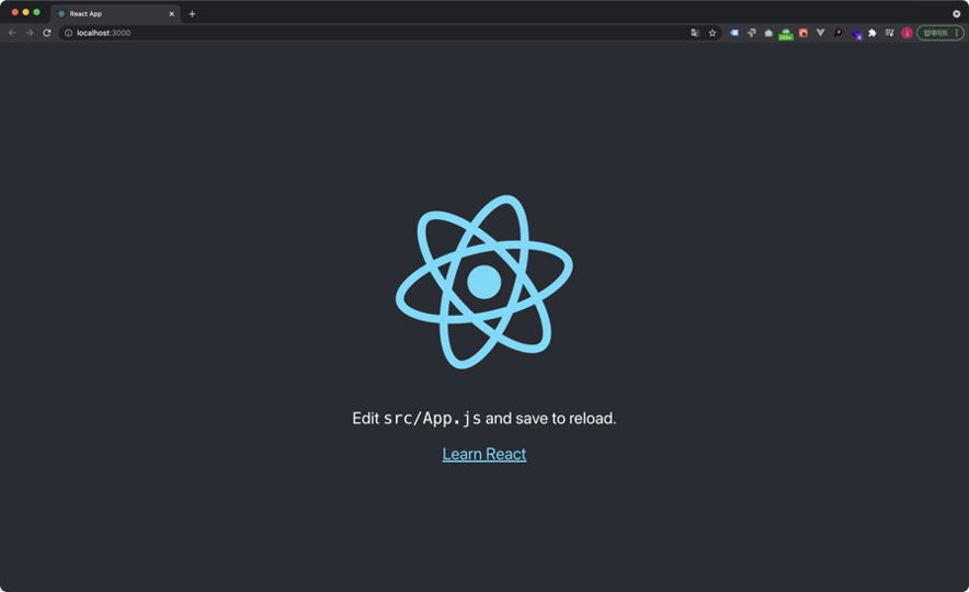 혹은 위 터미널에서 보여지는 주소로 접속하시면 위와같이 React 생성시 기본으로 만들어지는 기본 화면을 보실 수 있습니다.