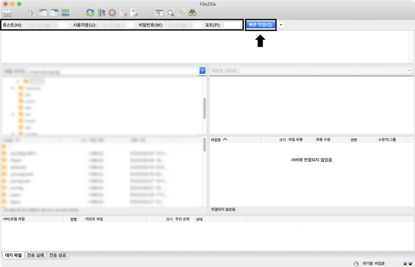이제 접속하실 호스트, 사용자명, 비밀번호, 포트 에 대한 정보를 입력 후 빠른 연결 버튼을 클릭하시면