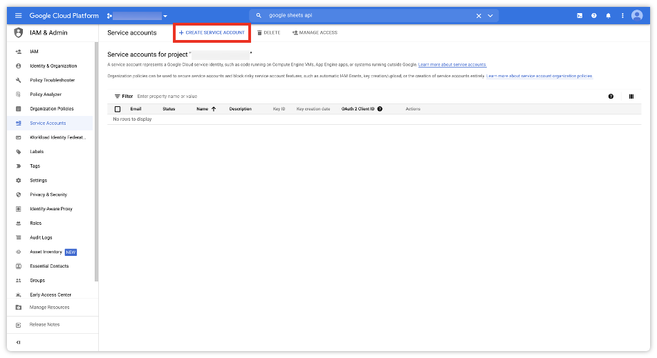 [CREATE SERVICE ACCOUNT] 버튼을 클릭하여 서비스 계정을 만들도록 하겠습니다.