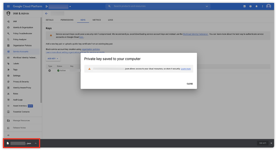 json 파일 형식의 키가 생성되면서 다운로드가 됩니다.
