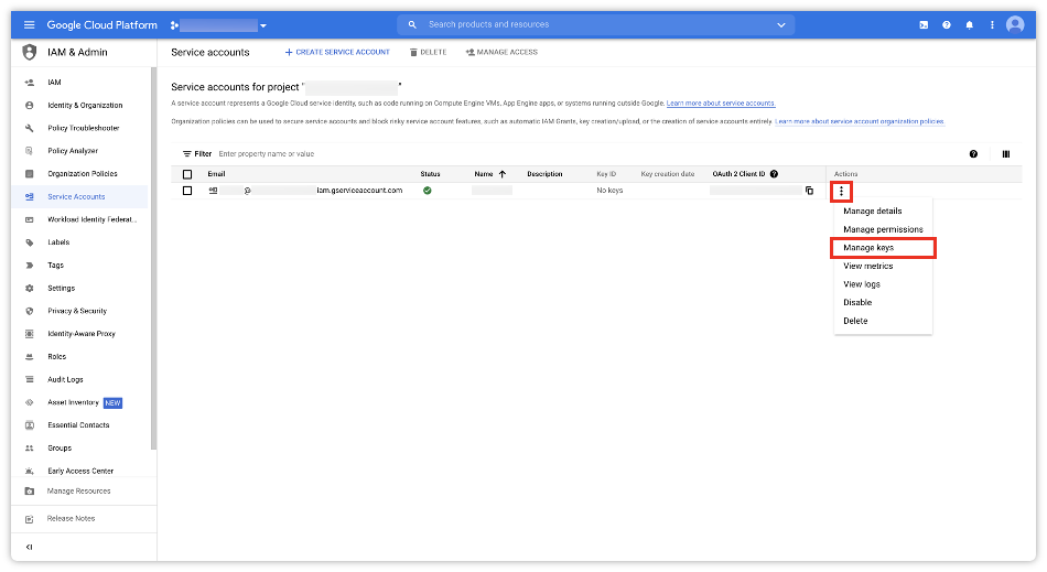 Service Account 가 생성되었으면 우측에 [Actions] 버튼을 클릭하고 [Manage Keys]를 클릭합니다.