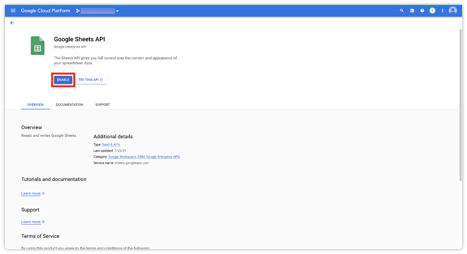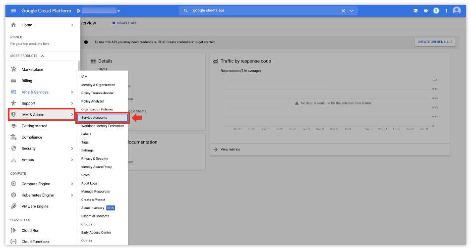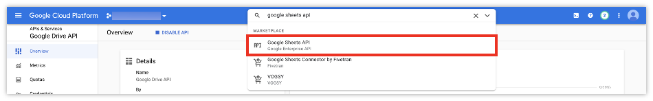 Google Cloud Platform에서 Google Sheets API를 검색합니다.