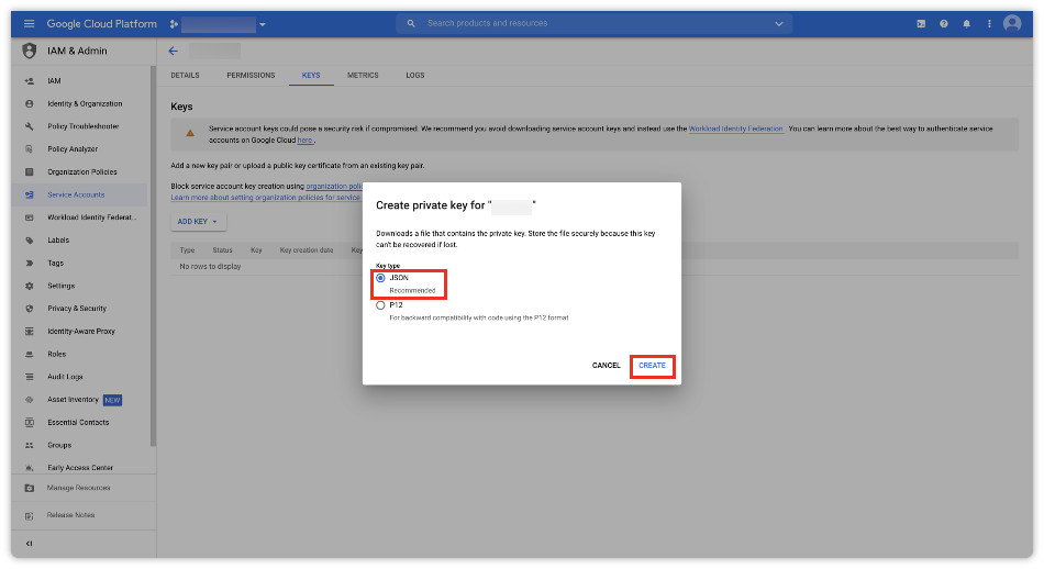 Key type 으로 [JSON] 을 선택하고 [CREATE] 버튼을 클릭하여 키를 생성합니다.