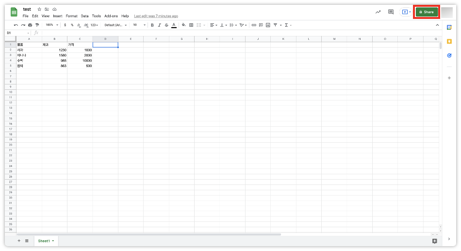 사용할 Google Sheet 에 들어가서 우측 상단에 [Share] 버튼을 클릭합니다.