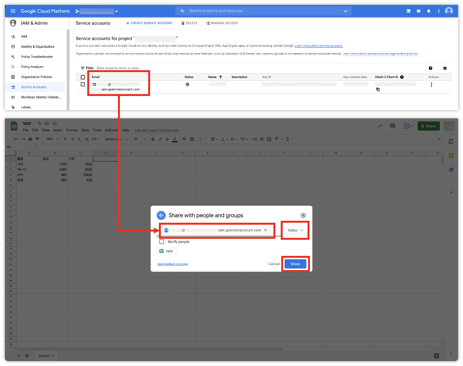 생성한 Sevice Account에게 사용할 Google Sheet에 대하여 사용 권한을 부여해줘야 합니다.