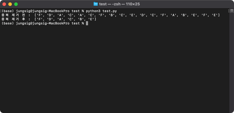 # 중복 제거 후 : ['F', 'D', 'A', 'C', 'B', 'E']