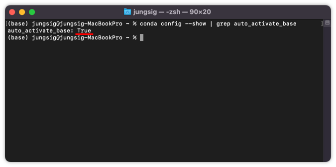auto_activate_base를 다시 한번 확인해보면 False 로 변경된 것을 확인할 수 있고,