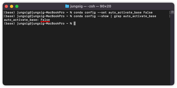 위 명령어를 사용하여 아나콘다 자동 활성화 모드를 비활성화 시킬 수 있습니다.