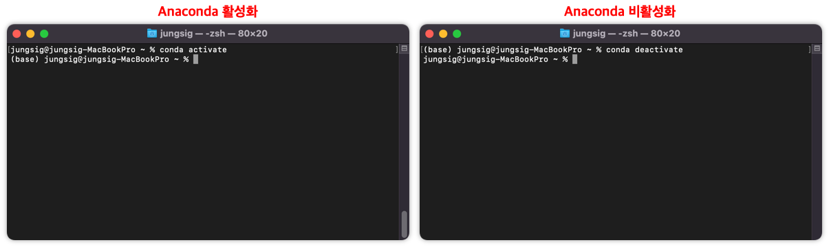 터미널을 실행할 때 마다 자동으로 Anaconda 기본 환경(base)이 활성화 되어 있는 것을 비활성화 하거나,