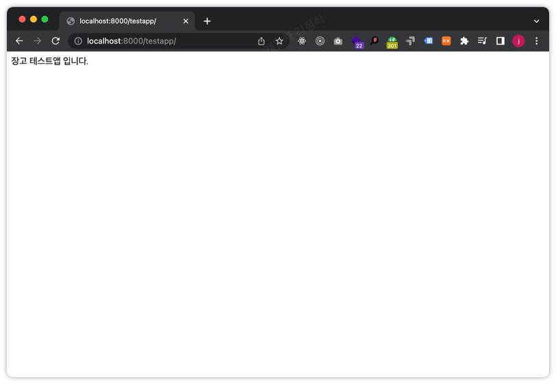 위와 같이 "장고 테스트앱 입니다." 라는 문자열이 출력되는 페이지를 보실 수 있습니다.