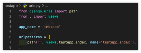 그리고 위와 같이 '/testapp' 경로로 들어오면 위에서 작성한 [testapp_index] 함수를 사용 할 수 있도록 합니다.