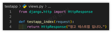 생성한 장고 앱의 [views.py] 파일에 "장고 테스트앱 입니다." 라는 문자열을 Response 해주는 함수를 하나 만들겠습니다.