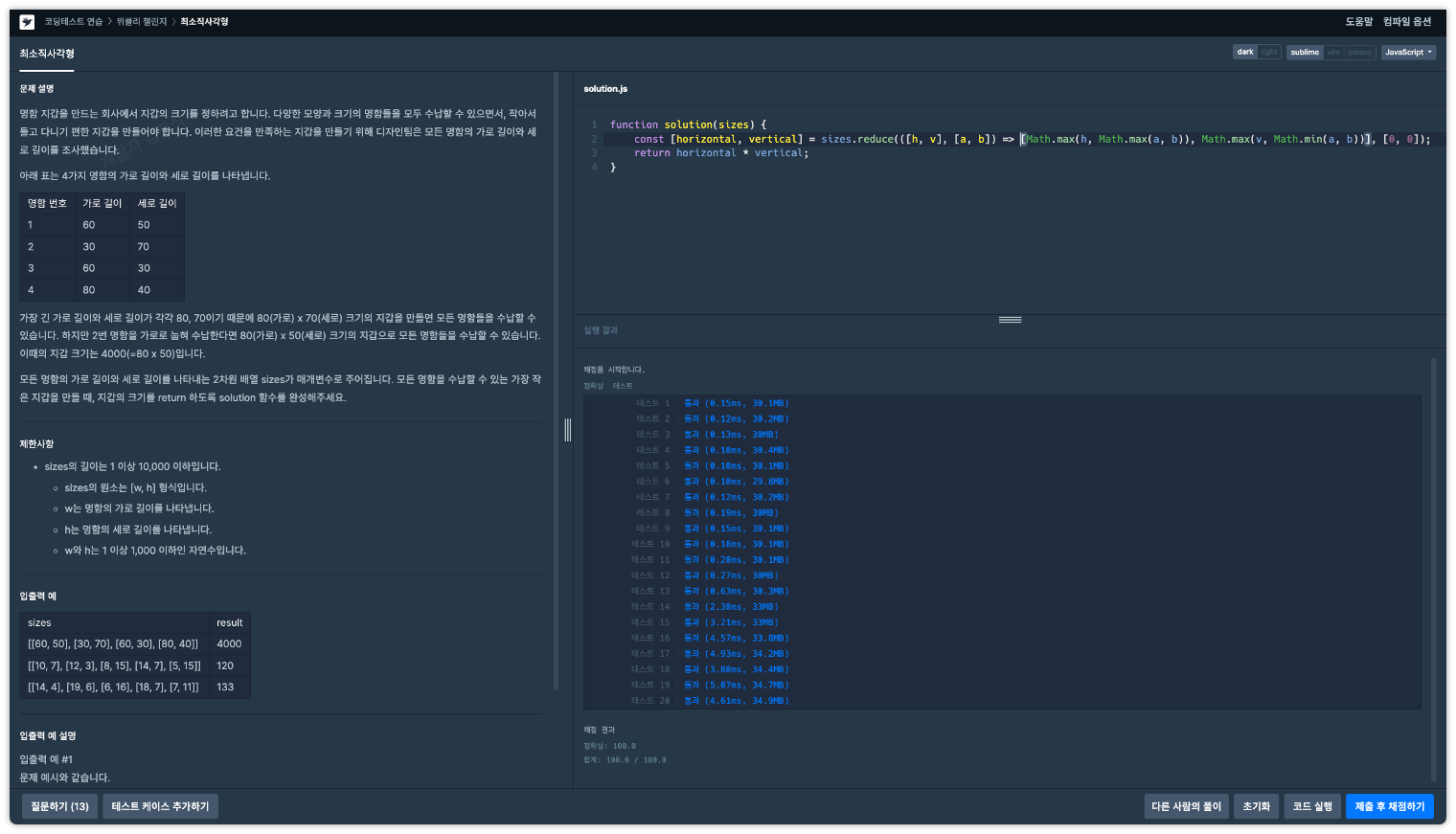 최소직사각형 문제를 JavaScript로 풀어보도록 하겠습니다.