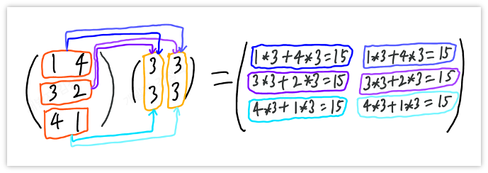 | [[1, 4], [3, 2], [4, 1]] | [[3, 3], [3, 3]] | [[15, 15], [15, 15], [15, 15]] |