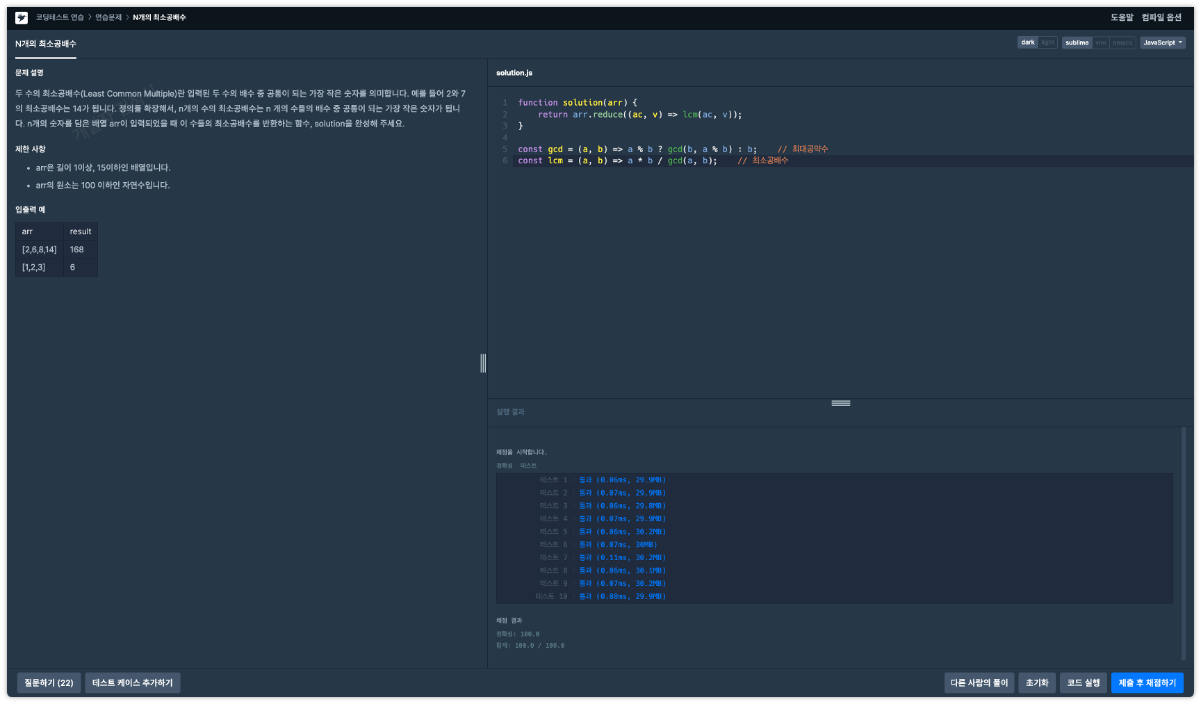 프로그래머스 코딩테스트 연습 Level 2 - N개의 최소공배수 (JavaScript)