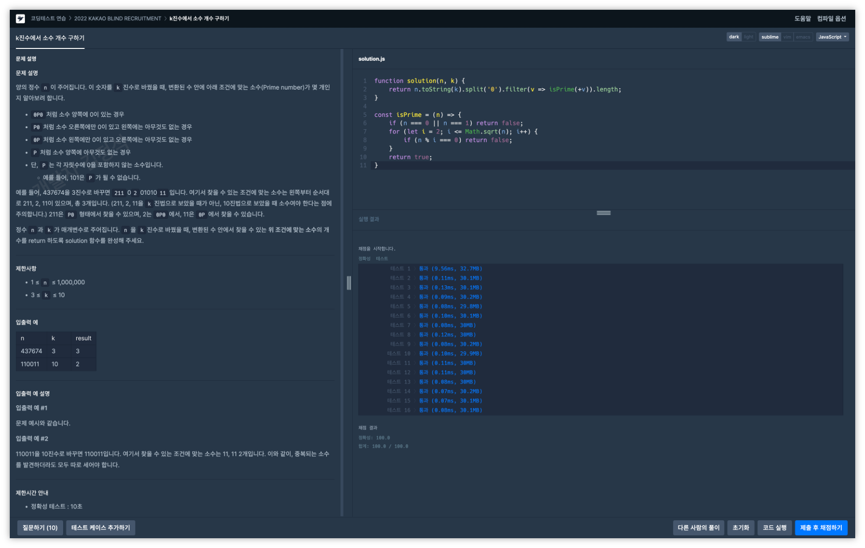 프로그래머스 Level2 2022 KAKAO BLIND RECRUITMENT 문제 - k진수에서 소수 개수 구하기 (JavaScript)