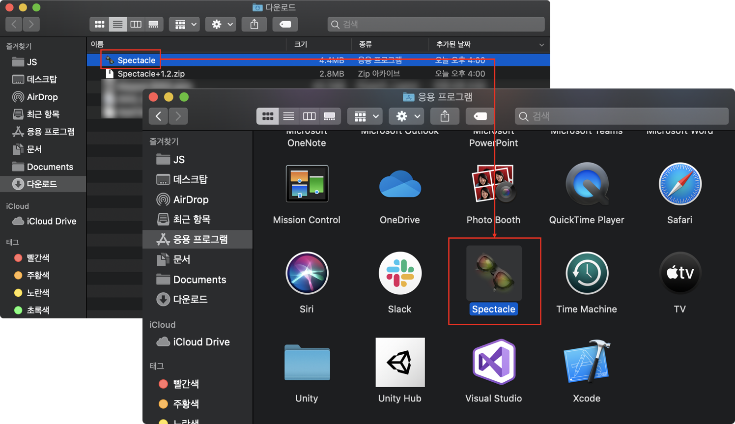 압축 해제한 Spectacle을 응용 프로그램 폴더로 옮겨줍니다.