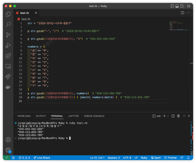 p str.sub(/[공일이삼사오육칠팔구]/) { |match| numbers[match] } # "0일공-일이삼-사오육-칠팔구"