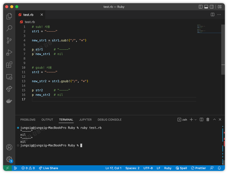 느낌표를 사용하지 않으면 sub 혹은 gsub 메소드를 사용하는 기존의 문자열 변수는 변경하지 않고, 치환이 완료된 새로운 문자열을 반환하지만,