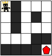 지금부터 당신은 한 팀의 팀원이 되어 게임을 진행하려고 합니다. 다음은 5 x 5 크기의 맵에, 당신의 캐릭터가 (행: 1, 열: 1) 위치에 있고, 상대 팀 진영은 (행: 5, 열: 5) 위치에 있는 경우의 예시입니다.