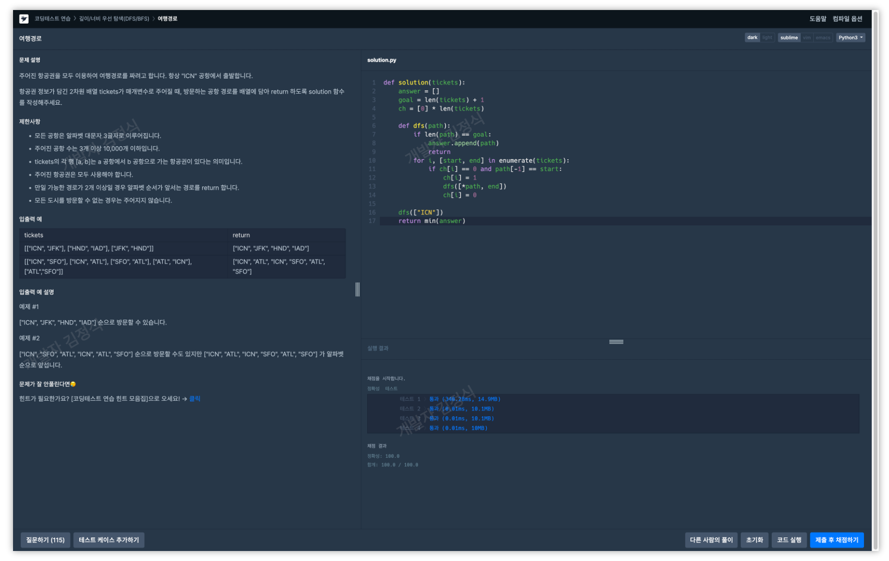 마지막으로 answer에 담긴 가능한 모든 여행경로 중 알파벳 순서로 가장 앞의 배열을 반환하기 위해 min()을 사용해주는 것으로 구한 뒤 반환하는 것으로 문제를 해결할 수 있습니다.