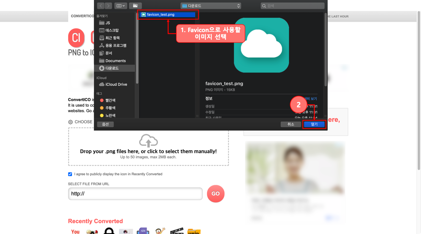 파비콘으로 사용할 이미지를 선택하고 열기 버튼을 클릭 해보겠습니다.